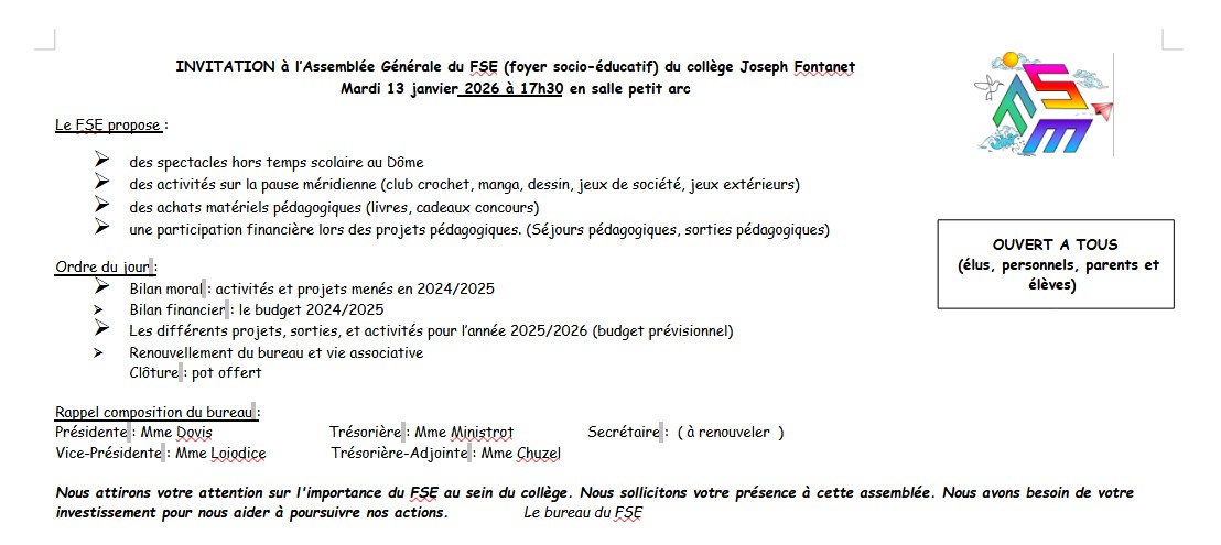 Invitation AG du FSE le mardi 13 janvier 17h30-18h30